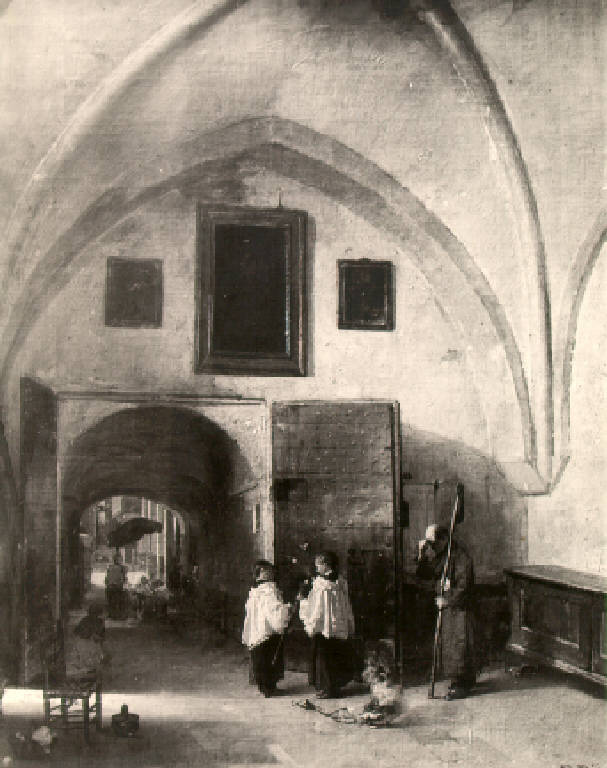 Veduta dell'interno di una sacrestia con figure