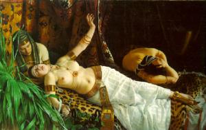 Stesa su una pelle di leopardo, Cleopatra vicina alla morte tende un braccio in alto, nella mano destra stringe l'aspide; alle sue spalle una serva le tiene il capo, ai suoi piedi, un'altra, il capo nelle mani, si dispera.