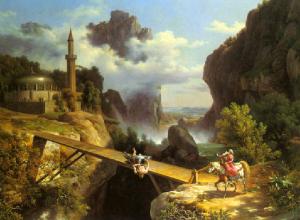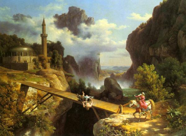 Su un ponte a precipizio su un dirupo Orlando e Rodomonte lottano furiosamente; a destra Fiordiligi, a cavallo, tende il braccio come per fermarli; a sinistra una moschea; dietro le figure un torrente vorticoso avvolge con la nebbia delle sue rapide le rupi circostanti; sullo sfondo paesaggio con mare e colline.