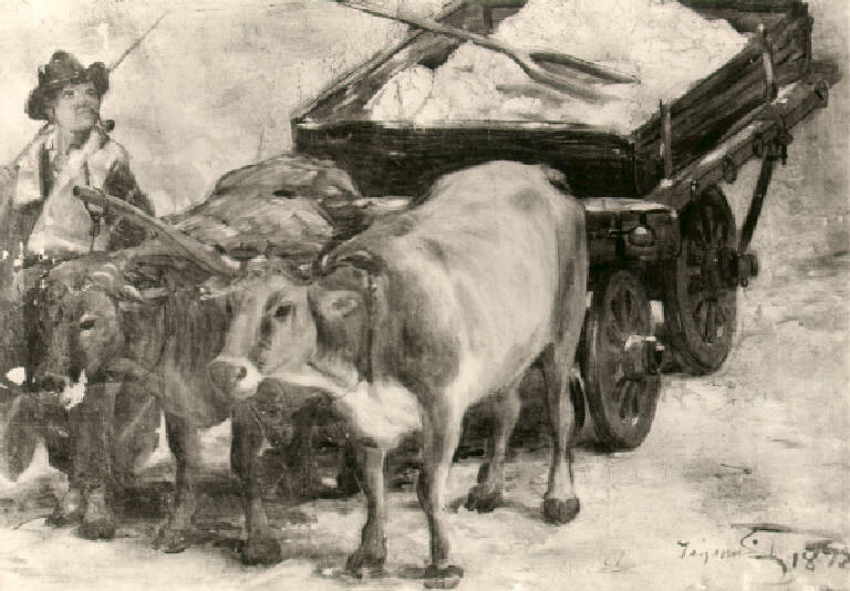 Un uomo con la pipa guida due buoi aggiogati che trainano un carro scoperto carico di neve, su questo un grosso badile in legno.