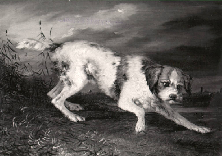 Un cane, rivolto verso destra, nell'atto di cercare; sullo sfondo paesaggio con campagna.
