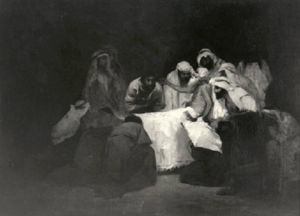 Giacobbe morente siede sul giaciglio posto di profilo nella stanza e alza il braccio destro; attorno a lui, personaggi maschili e femminili, la maggior parte dei quali ha il capo coperto.