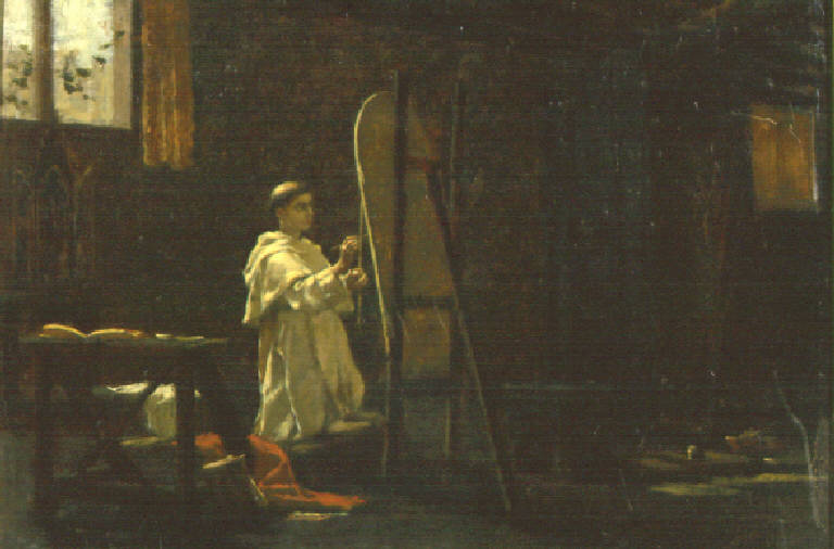 In un vano un frate inginocchiato, con una finestra alle spalle, dipinge una tavola appoggiata su cavalletto; nella stanza, altri utensili e opere.