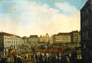 L'ampia piazza è chiusa su tre lati da edifici, fra i quali è in particolare evidenza il Municipio sull'estrema sinistra ; in primo piano, gruppi di personaggi che assistono alla sfilata del corteo di carrozze proveniente da sinistra.