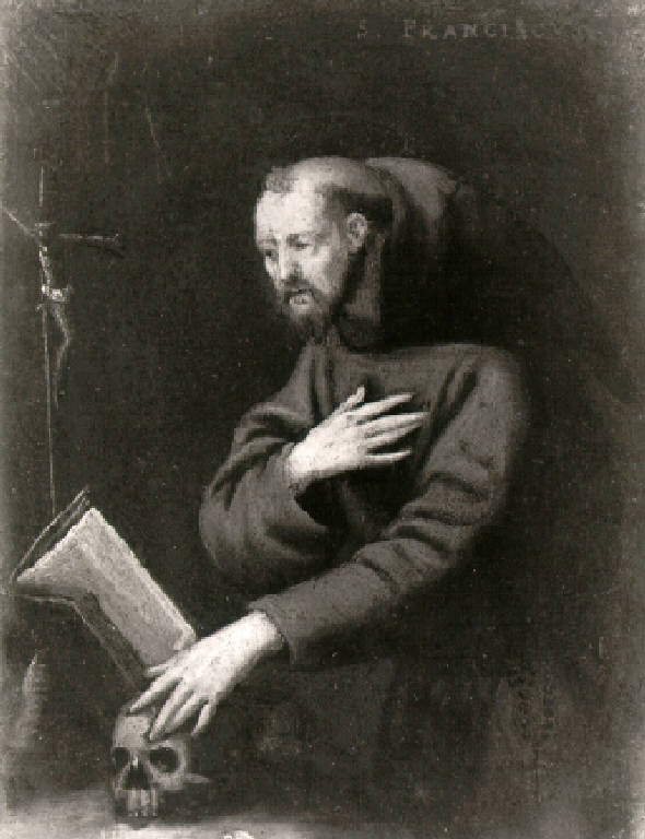San Francesco a mezza figura di scorcio verso sinistra in preghiera davanti al crocifisso cui appoggia un libro aperto mentre tiene la sinistra su un teschio.