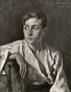 Ragazzo seduto, con camicia aperta sul petto, viso volto verso sinistra, ciuffo di capelli sulla fronte, un braccio appoggiato allo schienale della sedia.