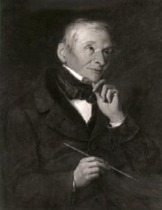 Luigi Basiletti, a tre quarti di figura, seduto, tiene nella mano destra u pennello, mentre con la sinistra si accarezza il mento guardando pensoso verso l'alto.