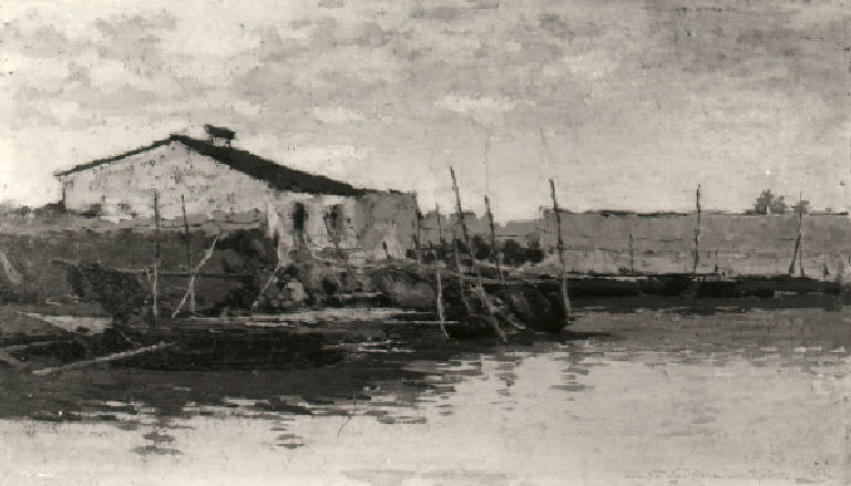 A sinistra, davanti ad una casa bassa e piatta, sono ormeggiate alcune barche; sul fondo, un lungo muro.