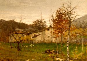 Davanti ad una casa, una donna spinge al chiuso delle oche; a sinistra, sotto un gruppo di alberi, altre figure.
