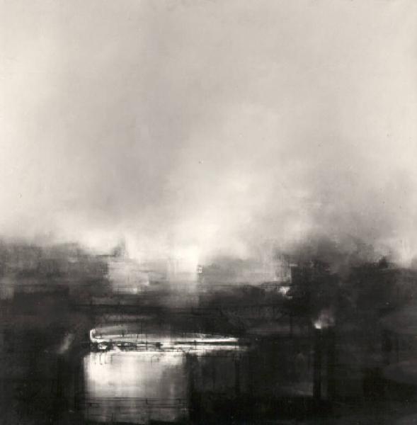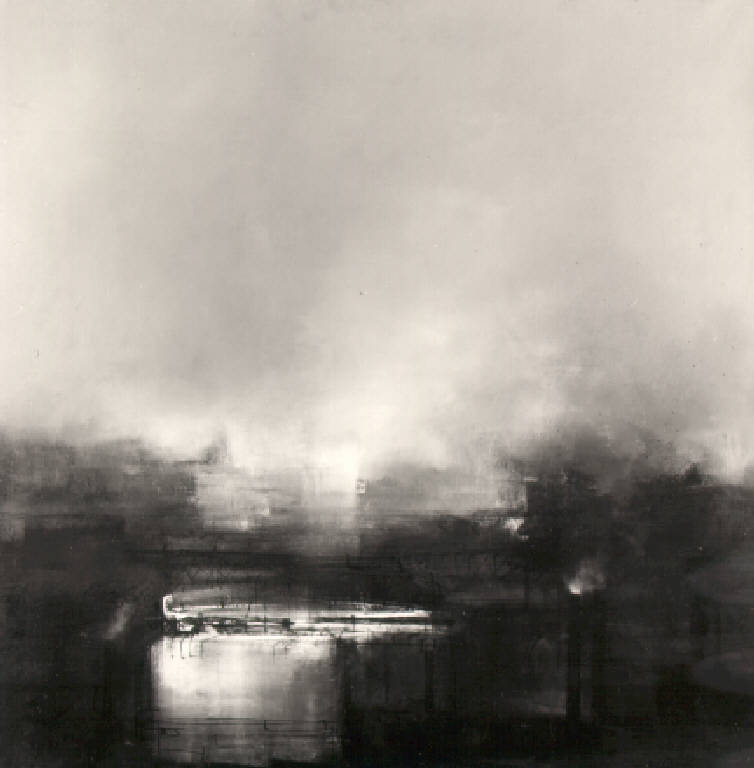 Ponte in struttura di metallo attraversa un fiume tra fumo e nebbia.