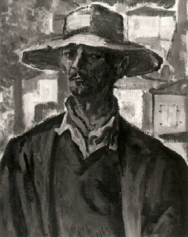 Uomo in piedi, a mezza figura e frontale, con cappello a larghe falde, baffi e fazzoletto rosso che sporge dalla camicia; sul fondo case.