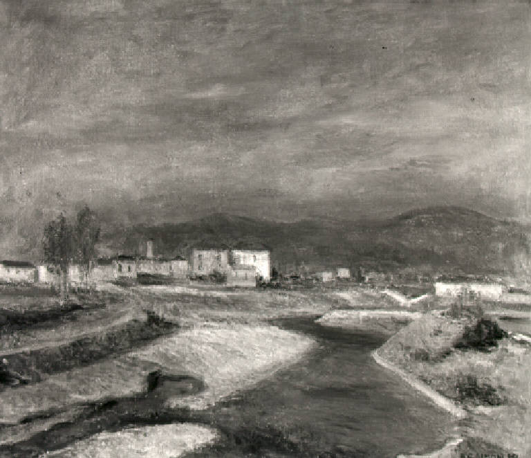 Veduta del fiume Mella che scorre accanto ad un paese a sinistra della composizione; nello sfondo colline.