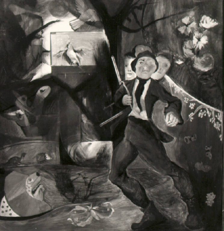 In un bosco popolato da uccelli di varia specie, farfalle, e persino un leone, avanza un cacciatore che reca sulla spalla il fucile; dietro di lui si scorgono le teste di altre figure.