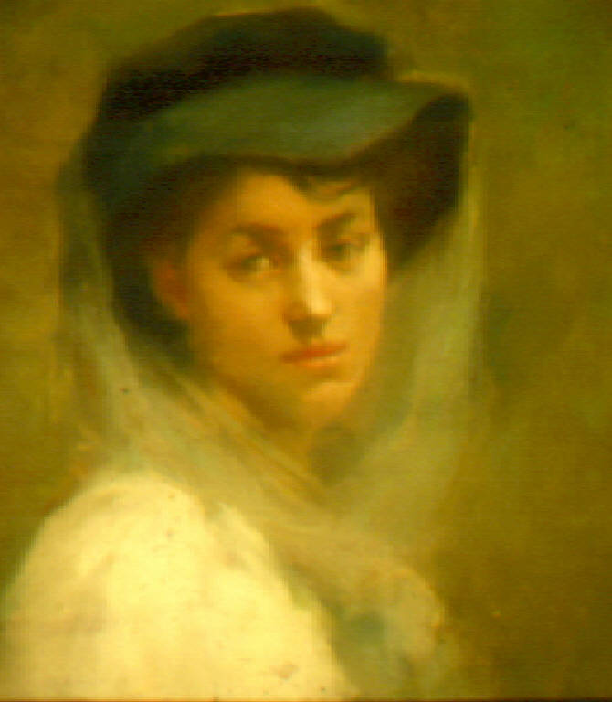 Donna giovane a mezzo busto di tre quarti indossa abito bianco e cappello a larga tesa da cui pende un velo che cade sul petto.
