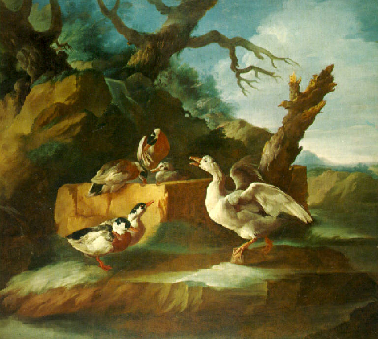 A destra, oca di profilo con ali aperte; a sinistra, due piccoli di anatra; al centro e più in alto su un gradone di roccia, altre tre anatre.