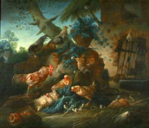 Al centro sul rudere di un muro si trovano un gallo e altri animali da cortile: alcuni stanno beccando frutti o verdure; in secondo piano a destra una casa diruta chiude la scena: sulla porta sconnessa sono appollaiate due galline, mentre altre si abbeverano da una vasca in pietra posta in basso.