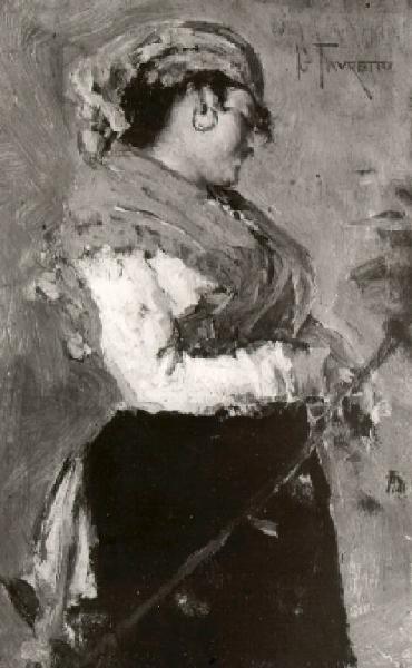 Una donna in abiti popolani in piedi verso destra a tre quarti di figura.