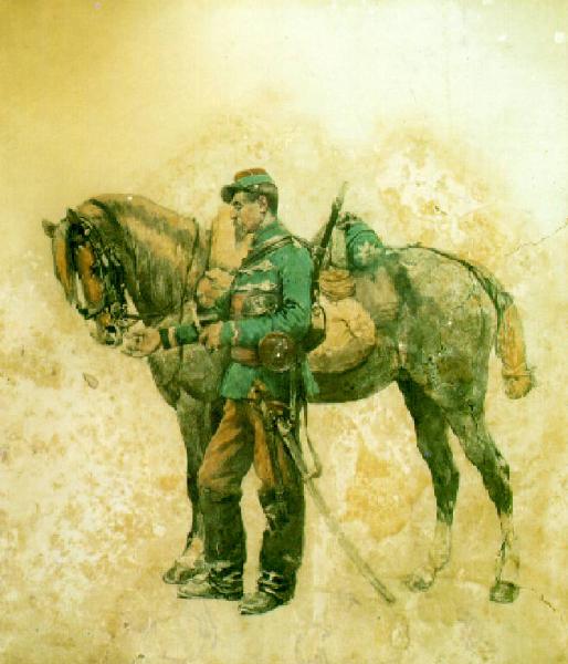 Un soldato con divisa da cavalleggero, in piedi, volto di profilo verso sinistra, tiene per le briglie il suo cavallo, pure di profilo verso sinistra