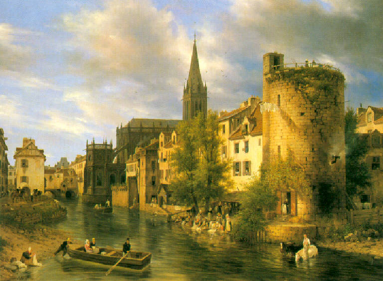 Su un canale si affacciano vari edifici; in primo piano a destra un torrione, sullo sfondo una chiesa gotica di cui si intravedono la torre campanaria e l'abside; a destra, sul canale, alcune lavandaie ed un uomo a cavallo, a sinistra degli uomini spingono un barcone sull'acqua, paesaggio sullo sfondo.