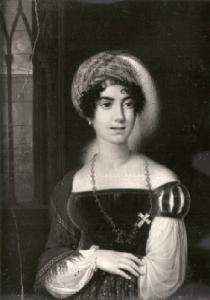 Una giovane donna, a mezza figura, tiene le braccia conserte e indossa un turbante con piuma, alle sue spalle una vetrata.