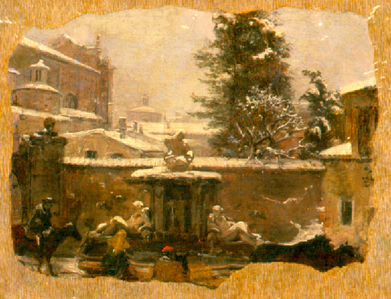 Veduta delle chiese di San Barnaba e San Luca sotto la neve; in primo piano una fontana con due figure maschili adagiate su un fianco.