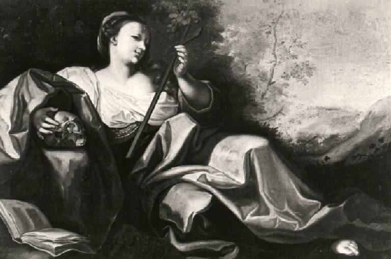 La figura femminile è seduta in terra e appoggia un braccio coperto da un ampio panneggio su un masso mentre con la mano regge un teschio visto di sottinsù; il viso è volto verso il crocefisso che la donna tiene in mano; in primo piano a sinistra un libro aperto, sullo sfondo un paesaggio.