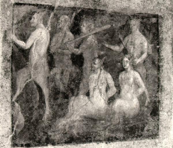 Due satiri seduti in primo piano e altri quattro in piedi in secondo piano e con bastoni.