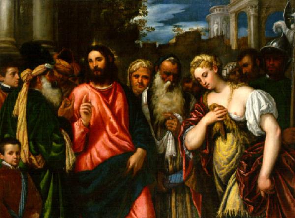 Circondati da un gruppo di personaggi che in varie pose assistono alla scena, a sinistra Gesù Cristo, in piedi, volto di tre quarti verso sinistra, tiene la mano destra alzata, reggendo con l'altra un lembo del mantello; a destra l'adultera, pure di tre quarti verso sinistra, tiene il capo chino, con la mano destra al petto e la sinistra abbassata, che pure legge un lembo della veste; sullo sfondo architetture e cielo con nuvole.