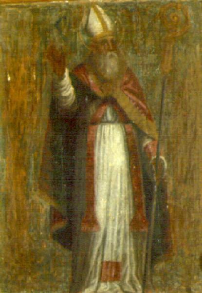 In piedi al centro, con i paramenti da vescovo e libro con tre palle d'oro, è San Nicola da Bari.