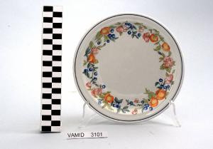 - NOTIZIE STORICO CRITICHE Il piatto in esame rientra in una tipologia di gusto corrente. La foggia semplice ed essenziale indica una evidente assimilazione dei concetti legati al funzionalismo e quindi una datazione ormai avanzata nel Novecento. Il motivo decorativo, realizzato mediante la tecnica della decalcomania, si inserisce in un filone di gusto per stoviglie e vasellame che richiama gli ornati naturalistici in voga all'inizio del Novecento. Questo revival fu particolarmente vivo tra gli anni '70 e '80 del secolo scorso. Il piatto fa parte di una donazione di privati al Museo.