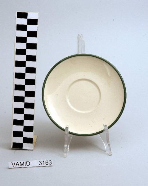 Piattino da thè circolare bianco; bordo rifinito in verde.