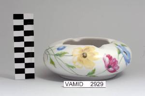 Posacenere a sezione circolare con corpo globulare schiacciato; fondo bianco decorato con motivo floreale policromo.