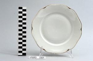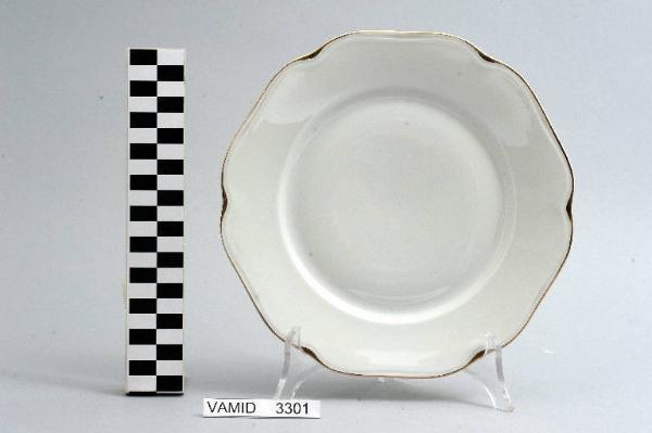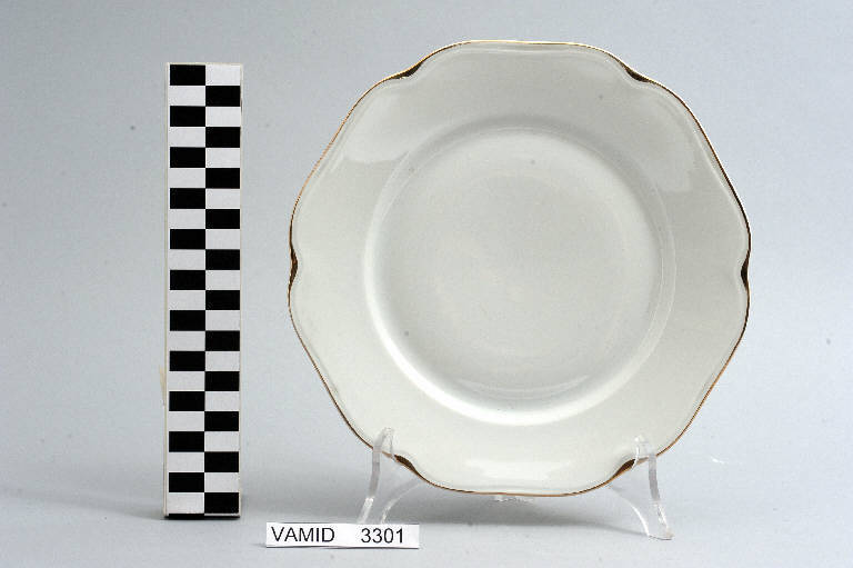- NOTIZIE STORICO CRITICHE L'oggetto in esame, appartenente ad un servizio da tavola composto da cinquantaquattro elementi (num. inv. 3102...3565), rientra in una tipologia di vasellame di gusto popolare. Il design sobrio ed elegante, una linea ondulata e il bordo sottolineato da una filettatura oro denotano una ricerca stilistica riferibile alla metà del Novecento. La ditta produttrice, denominata "Società Ceramica del Verbano", venne fondata nel 1924 per competere con la porcellana di Doccia. Malgrado la qualità materica e formale dei suoi servizi, la "Verbano", non ebbe mai sul mercato della porcellana la potenza e l'inventiva della Ginori. Il piatto fa parte di una donazione di privati al Museo.