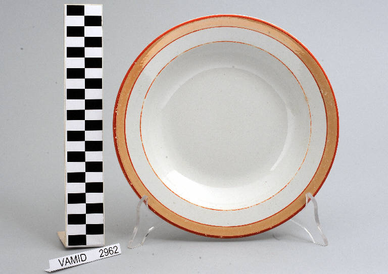 Piatto fondo circolare; fondo bianco avorio decorato con fascia arancio; bordo rifinito in rosso.