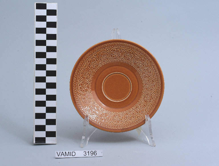 Piattino da thè circolare color terracotta; motivi decorativi geometrici e vegetali a rilievo lungo la tesa.