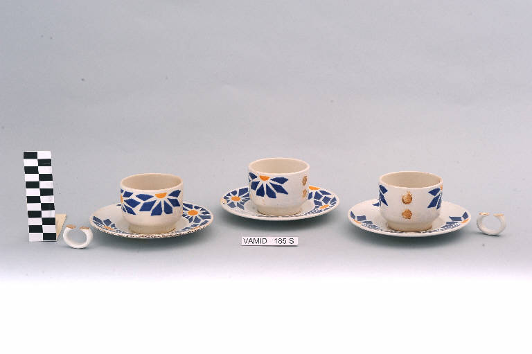 Servizio da thè composto da tre piattini e tre tazze; fondo color avorio decorato con fiori stilizzati in blu e giallo.