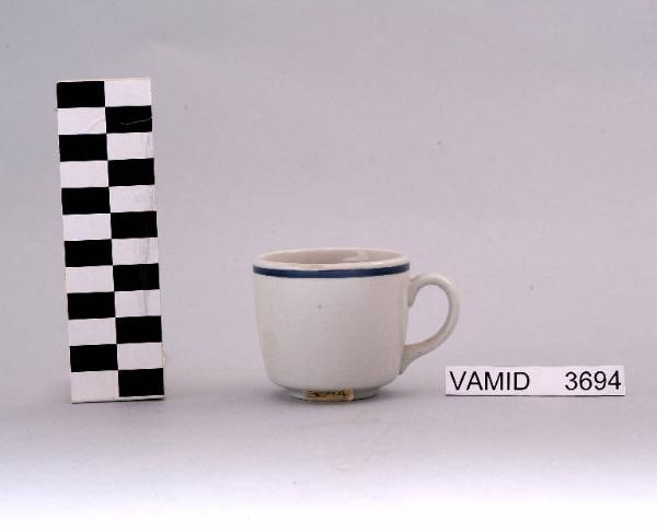 - NOTIZIE STORICO CRITICHE La foggia del manufatto in esame e la tipologia del decoro dei due piattini che completano il servizio (nn. inv. 3688, 3689) indicano una piena assimilazione della lezione del funzionalismo e quindi una datazione ormai oltre la metà del Novecento confermata anche dal marchio presente sul fondo usato dalla Richard Ginori dal 1950 al 1990 circa su tutti gli oggetti prodotti nello stabilimento di Lambrate. La tazzina, appartenente ad un servizio da caffè (num. inv. 3688-3695), fa parte di una donazione di privati al Museo.