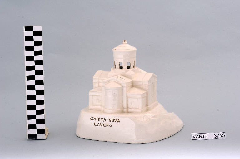 Salvadanaio bianco riproducente la chiesa nuova di Laveno Mombello con scritta in nero: struttura architettonica a croce greca con tiburio centrale cilindrico.