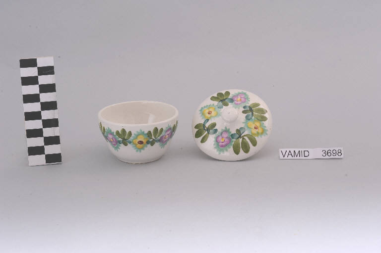 Zuccheriera con corpo leggermente svasato; coperchio circolare con presa apicale; fondo bianco decorato con motivo floreale policromo.