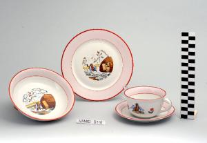 - NOTIZIE STORICO CRITICHE Il servizio da tavola da bambino, composto da quattro elementi (nn. inv. 2915, 2917, 2922, 2923), fu realizzato in porcellana bianca smaltata con filettature rosse sui bordi a delimitazione di una fascia di colore rosa e decorata con decalcomanie sopravernice con vignette illustranti la fiaba della cicala e della formica di Esopo, adattata anche da Jean de la Fontaine. Nel disegno, stilizzato e molto colorato per attirare l'attenzione dei bambini, vi sono delle strette affinità con le tipologie disegnative presenti nei contemporanei fumetti e cartoni animati per l'infanzia. Lo stabilimento Verbano di Laveno, costruito nel 1924 per la fabbricazione di isolatori in porcellana sulla base di un'intesa con la Porzellanfabrik Rosenthal di Selb (Baviera), iniziò la produzione di porcellana da tavola nel 1931: tale produzione cessò nel 1966.\nIl decoro compare nei cataloghi degli Articoli fantasia dello stabilimento Verbano della Società Ceramica Italiana con decoro numero 1525 (Busta 85, fascicolo 1 Archivio SCI).