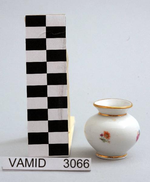 Vasetto, o bomboniera, di forma globulare in porcellana bianca con imboccatura estroflessa, filettature d'oro sui bordi e nella strozzatura dell'imboccatura, corpo decorato con piccoli fiori multicolori smaltati.