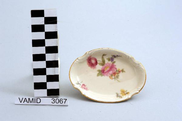 Piattino, o bomboniera, di forma ovale in porcellana bianca con bordo mistilineo stampato a rilievo e filettato d'oro, decorazione a decalcomania sopra vernice sul fondo e sulla tesa con tralci fioriti multicolori.
