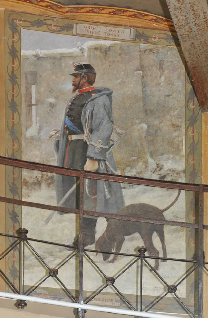 - NOTIZIE STORICO CRITICHE "Tra la terza e la quarta sala, lungo il percorso, lo stesso De Stefani ha realizzato, con la collaborazione del giovane Giuseppe Vizzotto Alberti, una prima serie di dieci "Ritratti di uniformi dell'Armata Sarda del 1859" tratti da modelli ad acquerello forniti dall'illustratore imolese Quinto Cenni e tratteggiati con pennellate asciutte, pulite, attente a rendere ogni figura con la necessaria chiarezza descrittiva e cromatica" [Regonelli S., Gli affreschi di San Martino della Battaglia. Il Risorgimento dipinto nel ciclo della Gran Torre, Torino, Allemandi & C. 2011, p. 39].