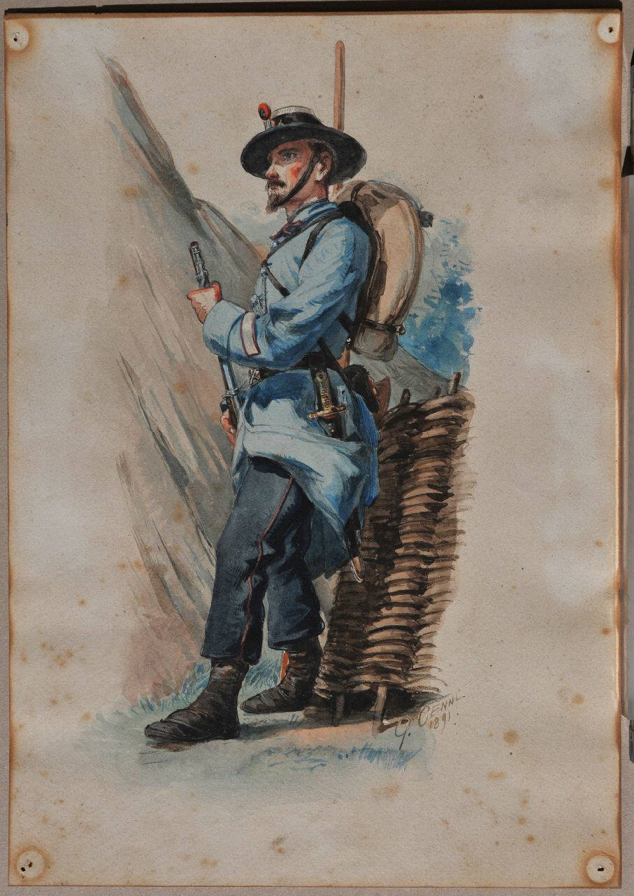 - NOTIZIE STORICO CRITICHE L'acquerello appartiene ad una raccolta di figurini militari nelle uniformi italiane. Le 20 tavole, firmate da Quinto Cenni, sonostate realizzate tra il 1889 ed il 1991.