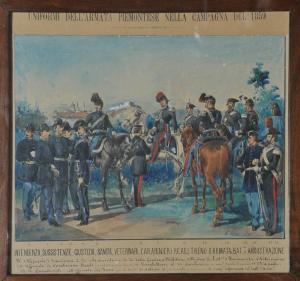 - NOTIZIE STORICO CRITICHE La litografia acquerellata appartiene ad una raccolta di cinque tavole realizzate da Quino Cenni nel 1880 e dedicate alla documentazione delle uniformi dell'Armata Piemontese nella campagna militare del 1859.