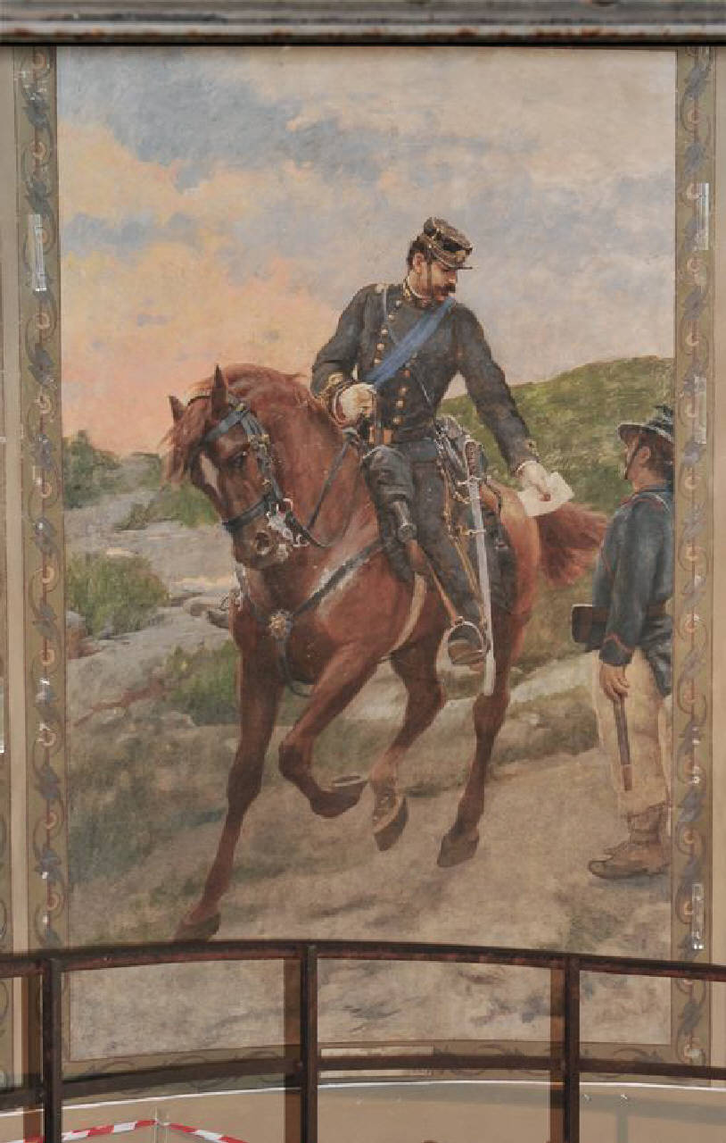 - NOTIZIE STORICO CRITICHE "Tra la terza e la quarta sala, lungo il percorso, lo stesso De Stefani ha realizzato, con la collaborazione del giovane Giuseppe Vizzotto Alberti, una prima serie di dieci "Ritratti di uniformi dell'Armata Sarda del 1859" tratti da modelli ad acquerello forniti dall'illustratore imolese Quinto Cenni e tratteggiati con pennellate asciutte, pulite, attente a rendere ogni figura con la necessaria chiarezza descrittiva e cromatica" [Regonelli S., Gli affreschi di San Martino della Battaglia. Il Risorgimento dipinto nel ciclo della Gran Torre, Torino, Allemandi & C. 2011, p. 39].