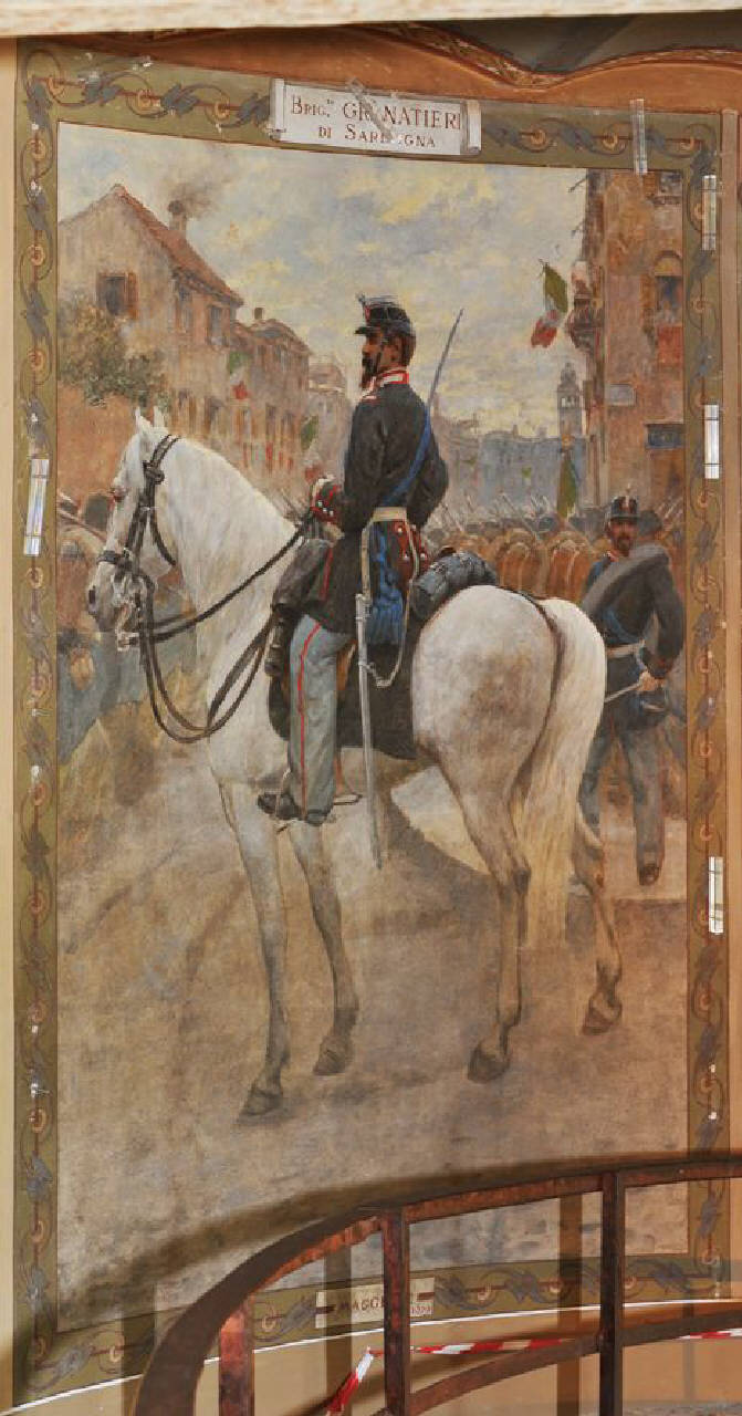 - NOTIZIE STORICO CRITICHE "Tra la terza e la quarta sala, lungo il percorso, lo stesso De Stefani ha realizzato, con la collaborazione del giovane Giuseppe Vizzotto Alberti, una prima serie di dieci "Ritratti di uniformi dell'Armata Sarda del 1859" tratti da modelli ad acquerello forniti dall'illustratore imolese Quinto Cenni e tratteggiati con pennellate asciutte, pulite, attente a rendere ogni figura con la necessaria chiarezza descrittiva e cromatica" [Regonelli S., Gli affreschi di San Martino della Battaglia. Il Risorgimento dipinto nel ciclo della Gran Torre, Torino, Allemandi & C. 2011, p. 39].