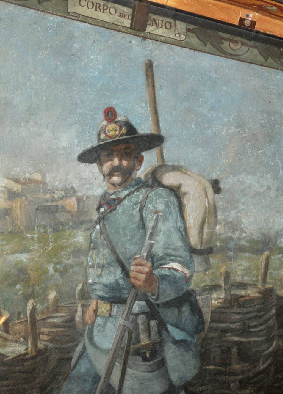 - NOTIZIE STORICO CRITICHE "Tra la terza e la quarta sala, lungo il percorso, lo stesso De Stefani ha realizzato, con la collaborazione del giovane Giuseppe Vizzotto Alberti, una prima serie di dieci "Ritratti di uniformi dell'Armata Sarda del 1859" tratti da modelli ad acquerello forniti dall'illustratore imolese Quinto Cenni e tratteggiati con pennellate asciutte, pulite, attente a rendere ogni figura con la necessaria chiarezza descrittiva e cromatica" [Regonelli S., Gli affreschi di San Martino della Battaglia. Il Risorgimento dipinto nel ciclo della Gran Torre, Torino, Allemandi & C. 2011, p. 39].