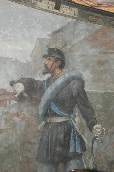 - NOTIZIE STORICO CRITICHE "Tra la terza e la quarta sala, lungo il percorso, lo stesso De Stefani ha realizzato, con la collaborazione del giovane Giuseppe Vizzotto Alberti, una prima serie di dieci "Ritratti di uniformi dell'Armata Sarda del 1859" tratti da modelli ad acquerello forniti dall'illustratore imolese Quinto Cenni e tratteggiati con pennellate asciutte, pulite, attente a rendere ogni figura con la necessaria chiarezza descrittiva e cromatica" [Regonelli S., Gli affreschi di San Martino della Battaglia. Il Risorgimento dipinto nel ciclo della Gran Torre, Torino, Allemandi & C. 2011, p. 39].