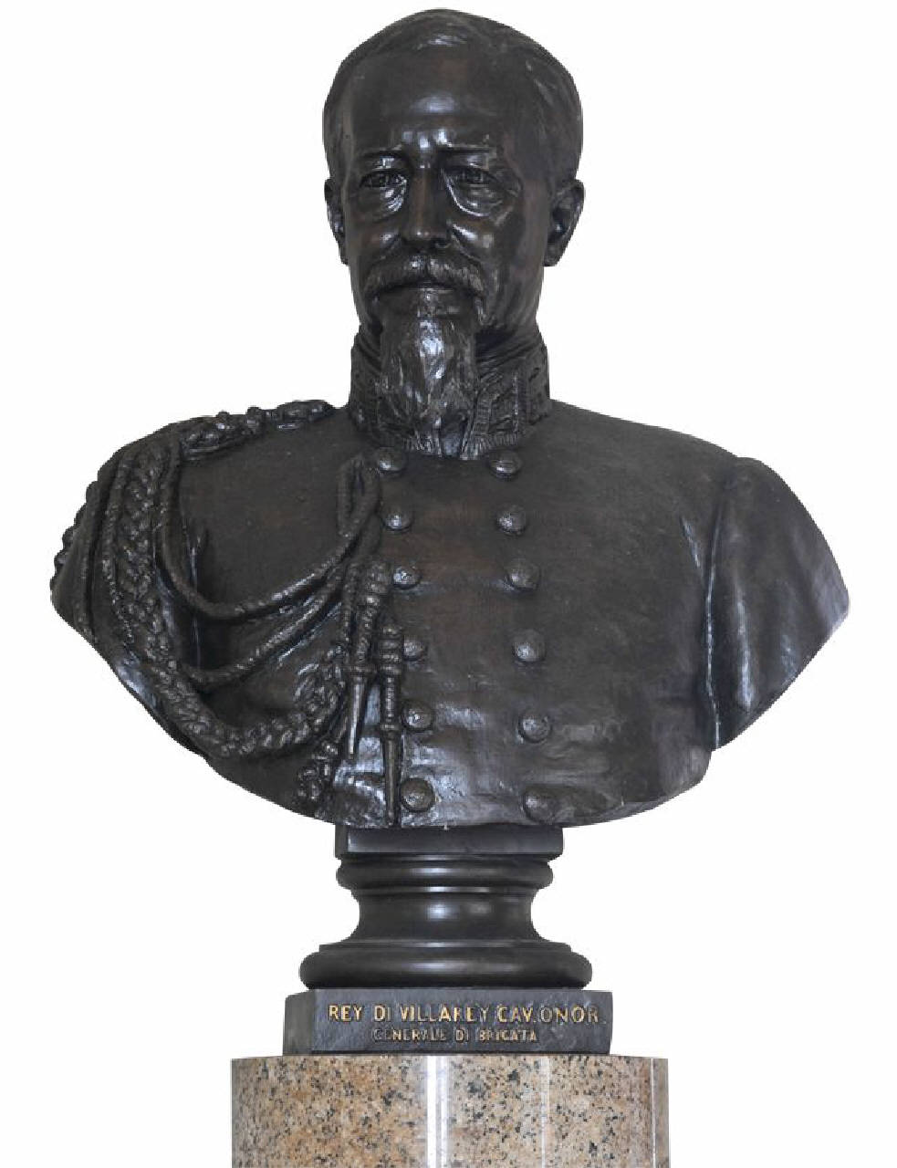 - NOTIZIE STORICO CRITICHE La sala al pianterreno è "dedicata alla celebrazione di Vittorio Emanuele II. I testi dell'epoca la descrivono come una vera e propria "Sala della Riconoscenza", realizzata come una ridotta versione del Pantheon romano, sepoltura del sovrano; l'architettura, infatti, ne riprende la struttura a pianta centrale, movimentata dall'apertura di spazi laterali chiusi da cancellate e la volta, culminante in un oculo decorato da un'elegante stella in ferro battuto. La medesima forma stellata, allusione alla leggendaria frase pronunciata dal re al momento della vittoria ("Havvi proprio una stella anche per l'Italia"), si ritrova anche all'ingresso della sala e nell'intarsio marmoreo pavimentale che circonda la base del suo ritratto bronzeo, che troneggia al centro della sala, opera dell'esperta mano del veneziano Antonio Dal Zotto.(...) Il ritratto è circondato da una serie di otto busti, sempre in bronzo, collocati ai lati di ognuna delle quattro scene dipinte sulle pareti, realizzati dalla mano meno esperta ma volonterosa del catanzarese Salvatore Pisani. I busti raffigurano i volti e i petti gloriosamente ricoperti di medaglie di otto generali caduti in battaglia, collocati a formare un ideale stato maggiore riunito intorno al proprio generale". Questo busto ritrae il Generale di Brigata Cavaliere Onorato Rey di Villarey, morto nel 1866 a Mongabia di Verona [Regonelli S., Gli affreschi di San Martino della Battaglia. Il Risorgimento dipinto nel ciclo della Gran Torre, Torino, Allemandi & C. 2011, p. 36].